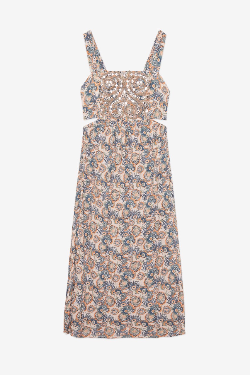 Midi dress with straps and square neckline. Cut-out on the sides and embroidered rhinestone details on the front.
