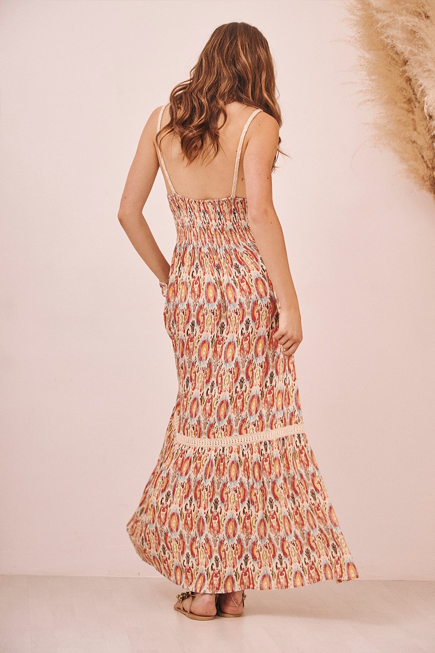 Long printed dress with braided straps. V-neckline with beads on the chest. Gathered elastic at the waist. Detail of crochet ribbon with openwork at the knee.