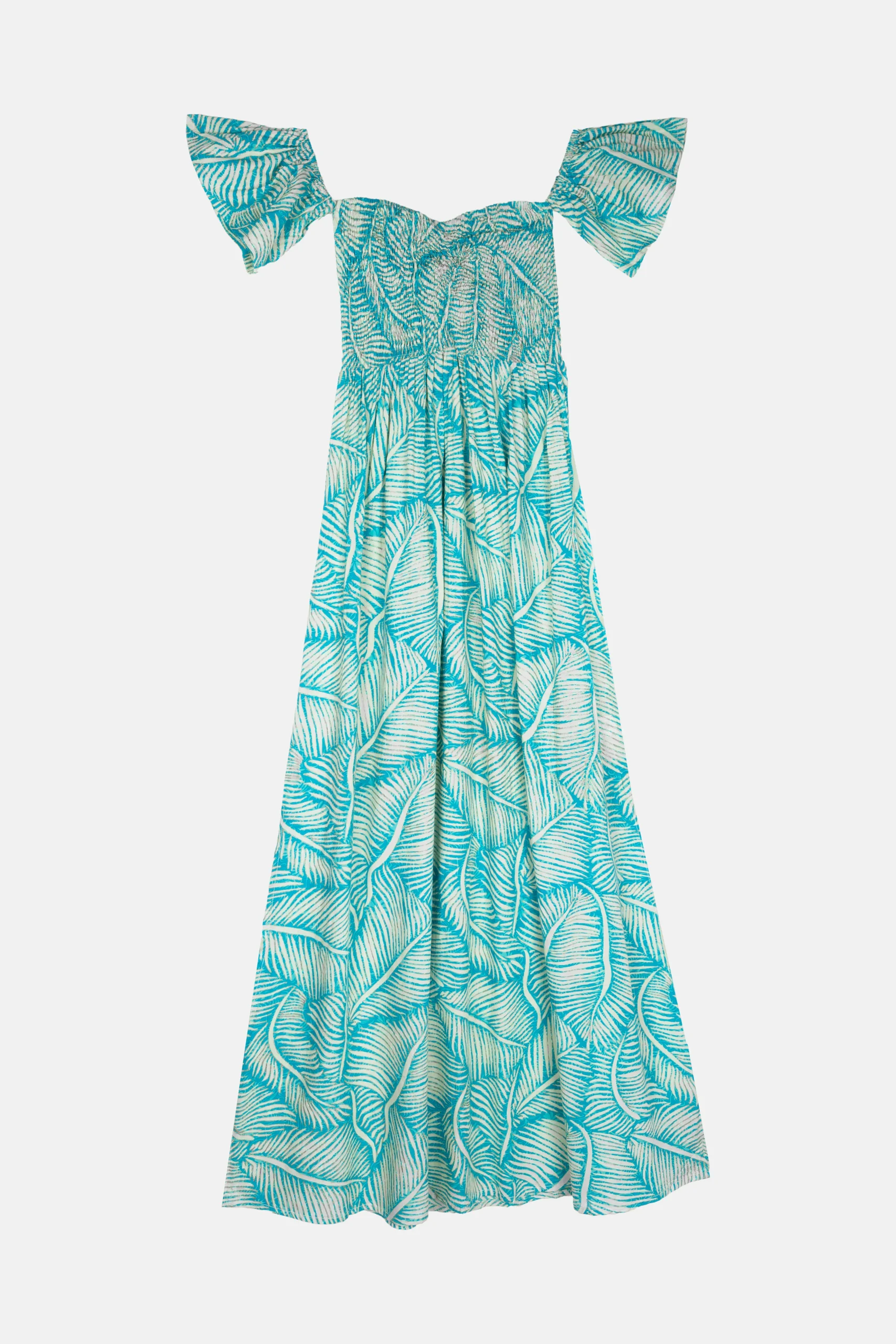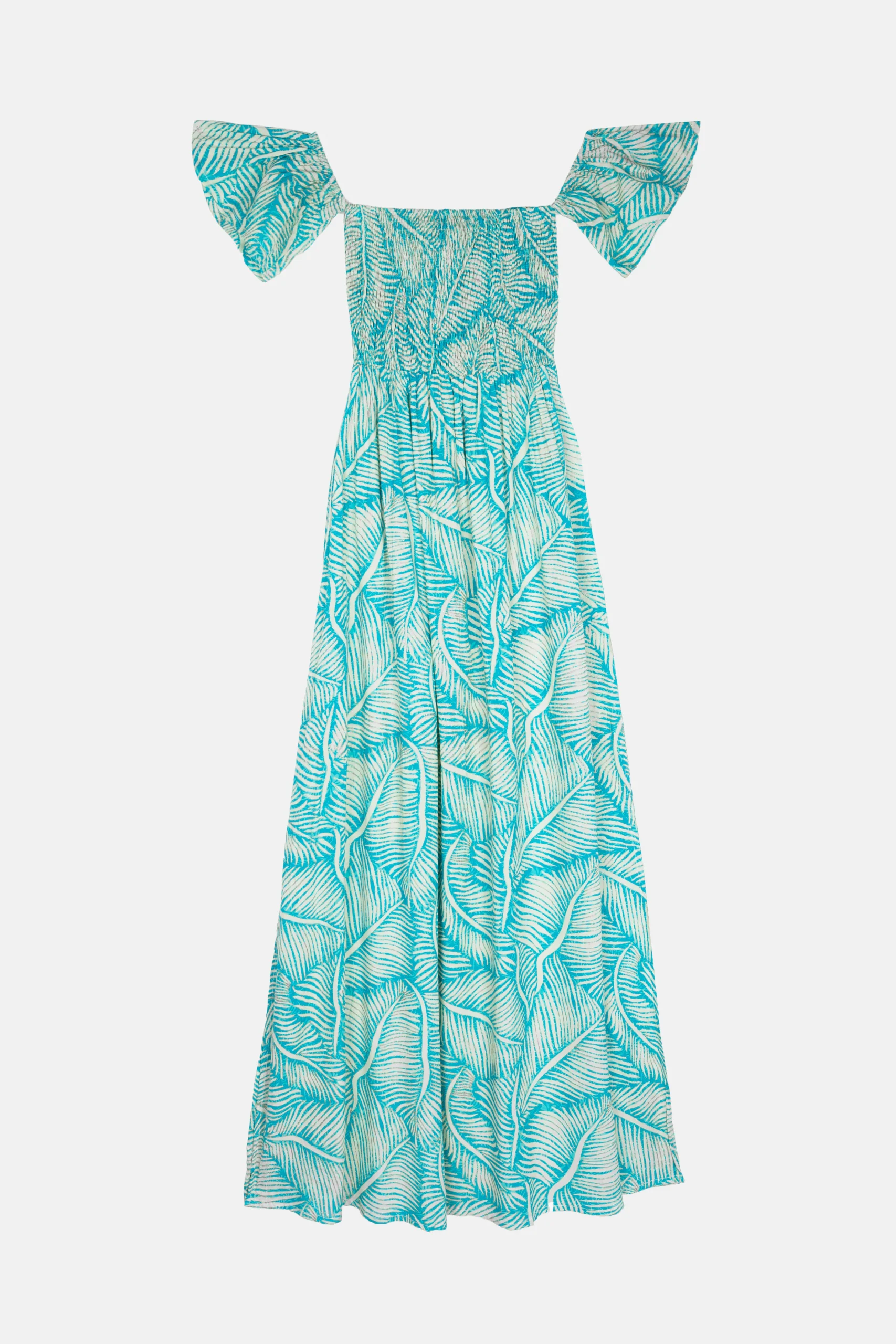 The Palm Aqua long dress is a stunning piece in a cool aqua hue. With a flowing design and soft drape, this dress is ideal for formal events or special dinners.