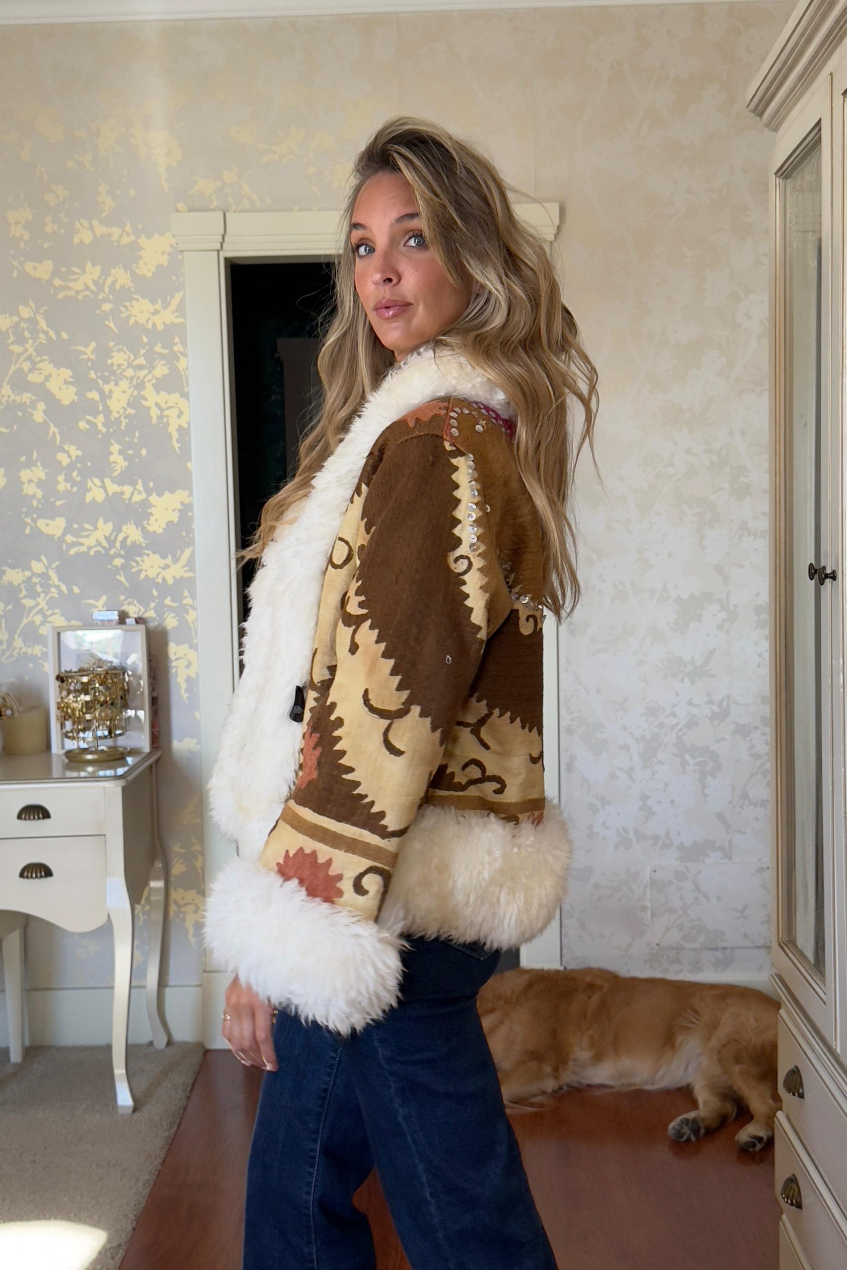 ADARA ABRIGO BOHEMIO EN SEDA VINTAGE BORDADA CON LENTEJUELAS CON FORRO Y CUELLO DE PIEL S