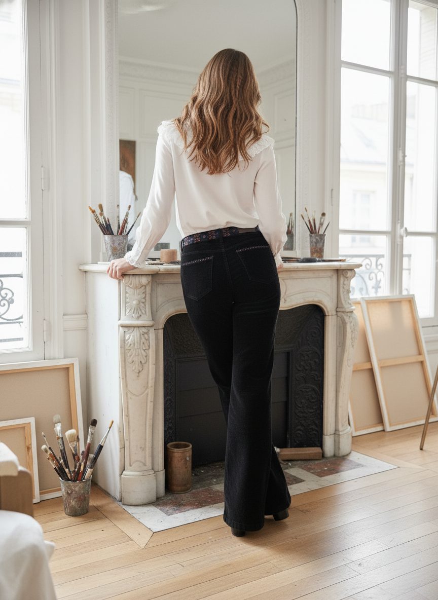 Pantalón de pana  de tiro alto de inspiración años 70`,con detalle bordado en la cintura.