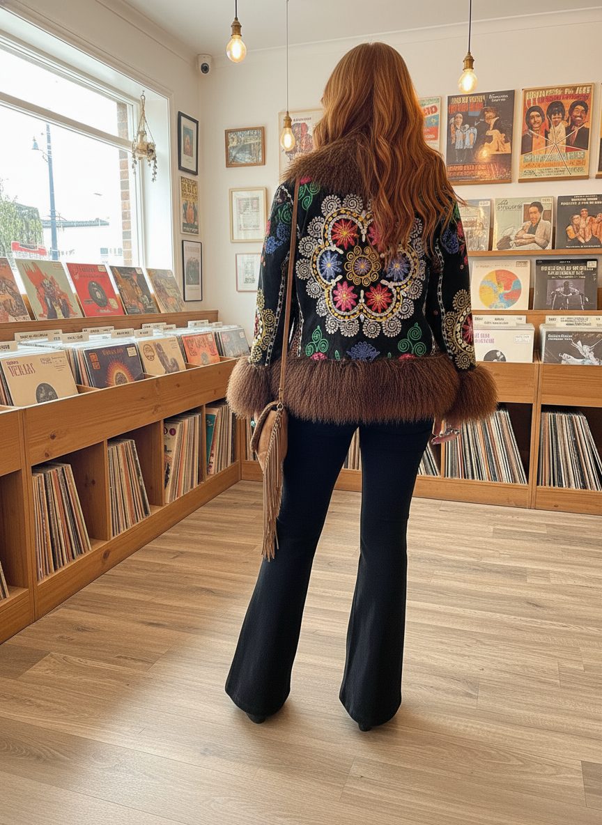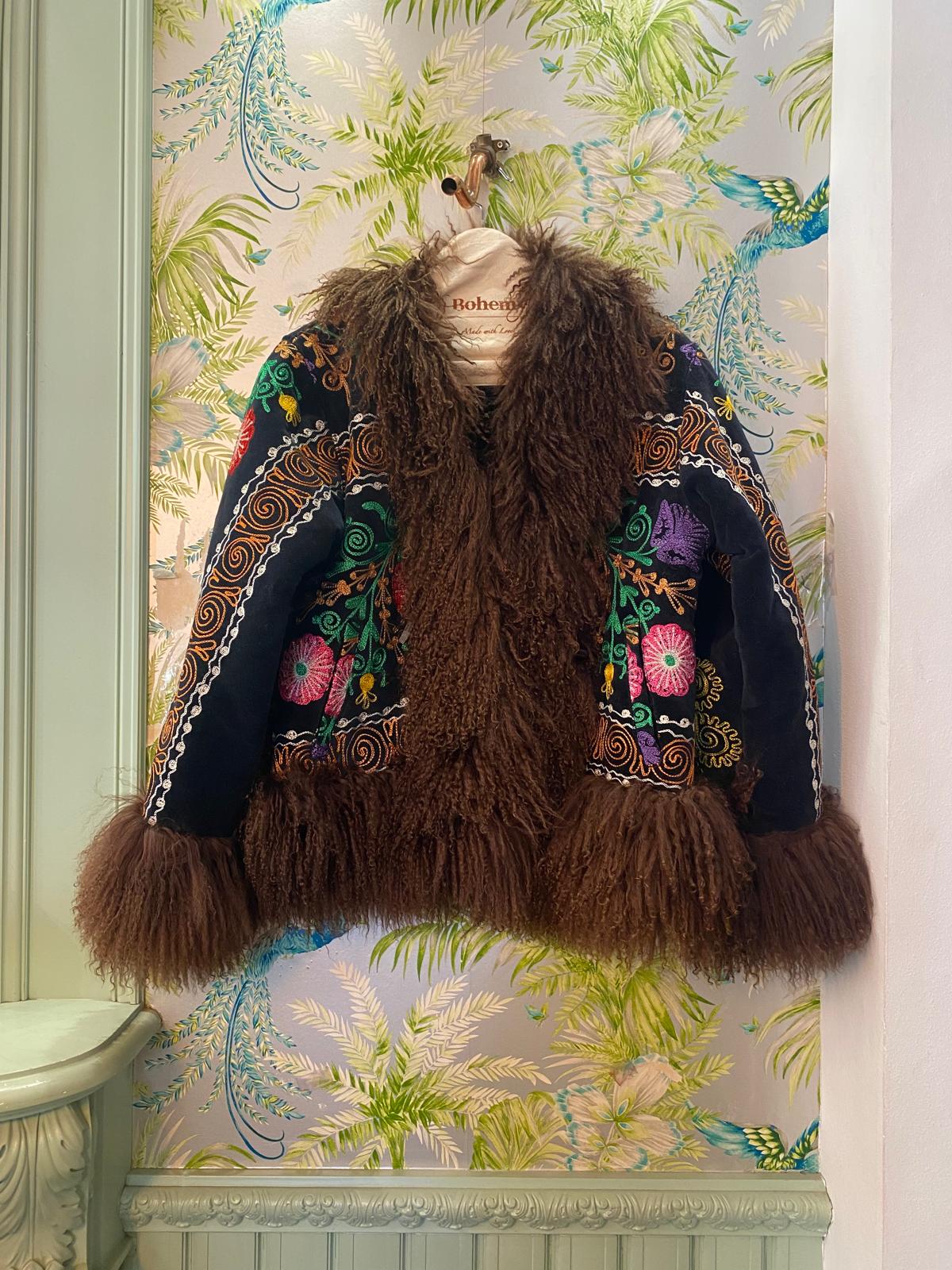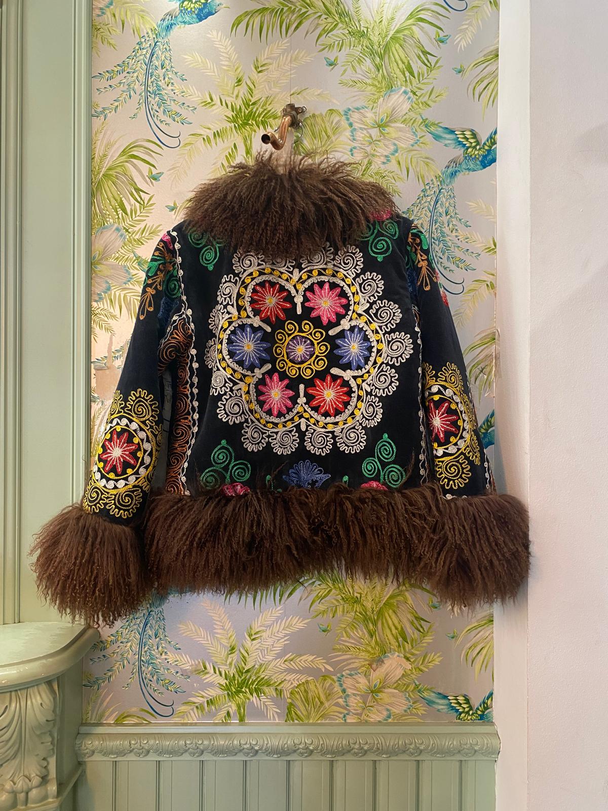 Abrigo bohemio realizado en tela vintage de terciopelo bordado, forro y cuello de piel natural de cordero.
