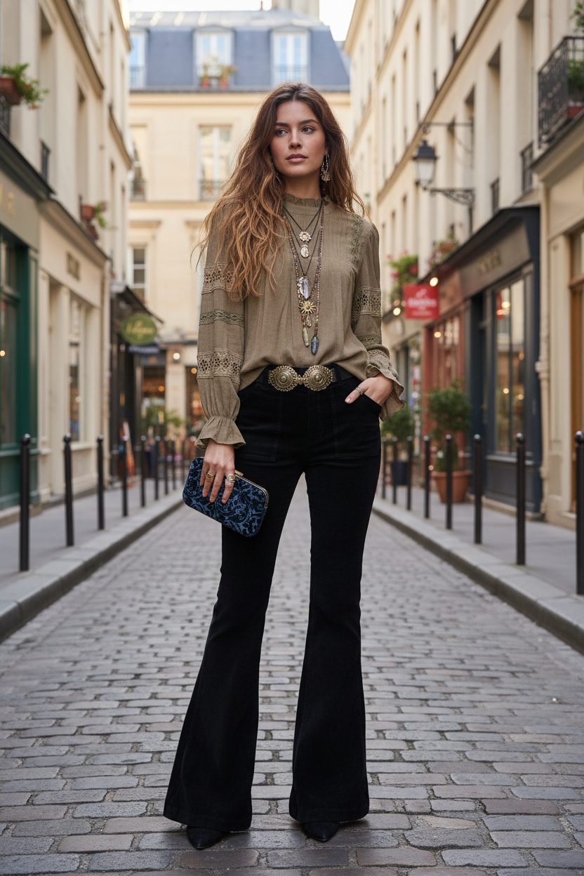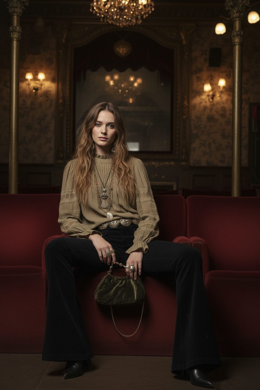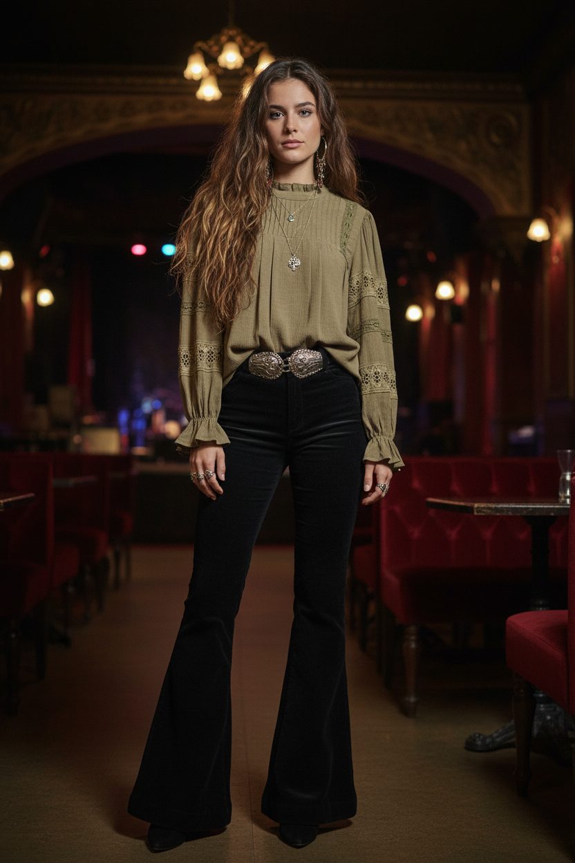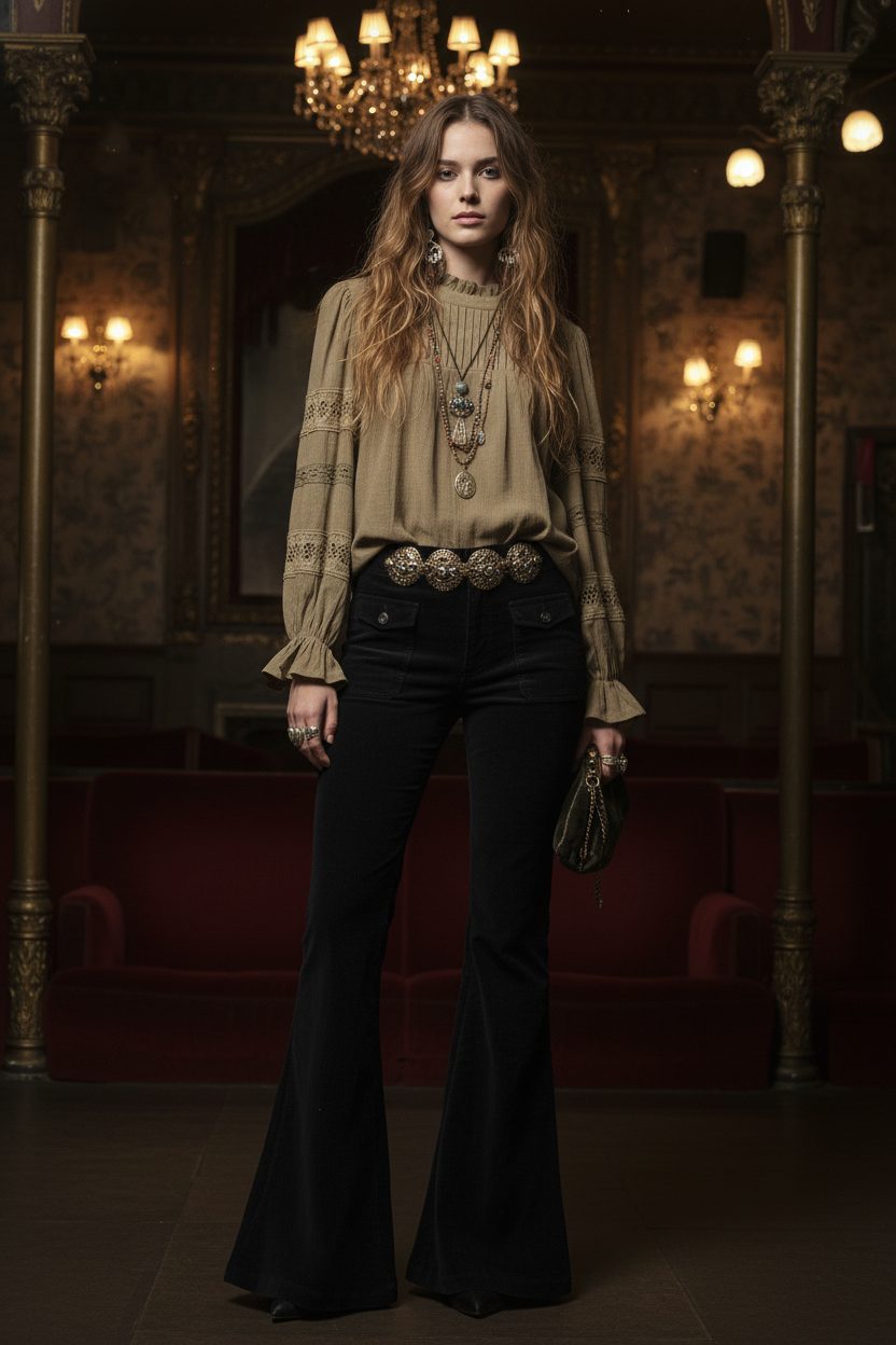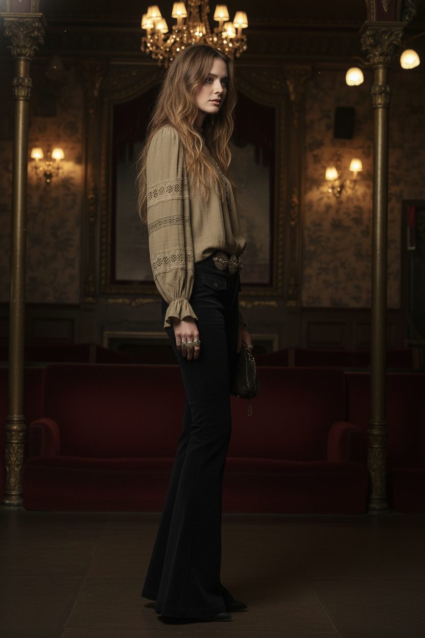 Blusa con escote cerrado con cierre de botón en la espalda y detalle de plisados sobre el pecho. Manga larga abullonada con puños acabados en volante. Detalle de cintas de puntilla con calados en mangas y hombros.