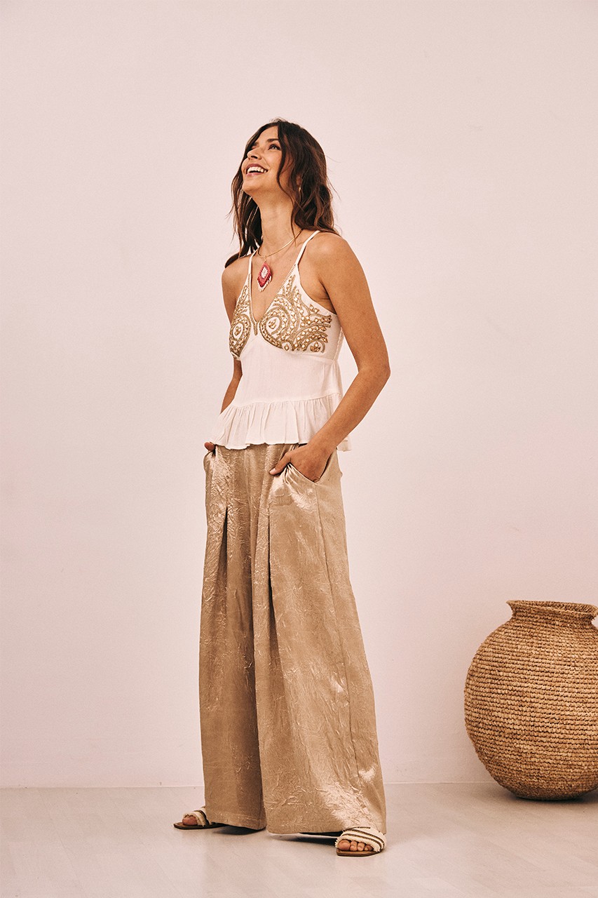 Blusa cruzada de manga tres cuartos holgadas y largo cropped, hasta la cintura, con estampado de flores. Escote V ribeteado con cinta de abalorios bordados.