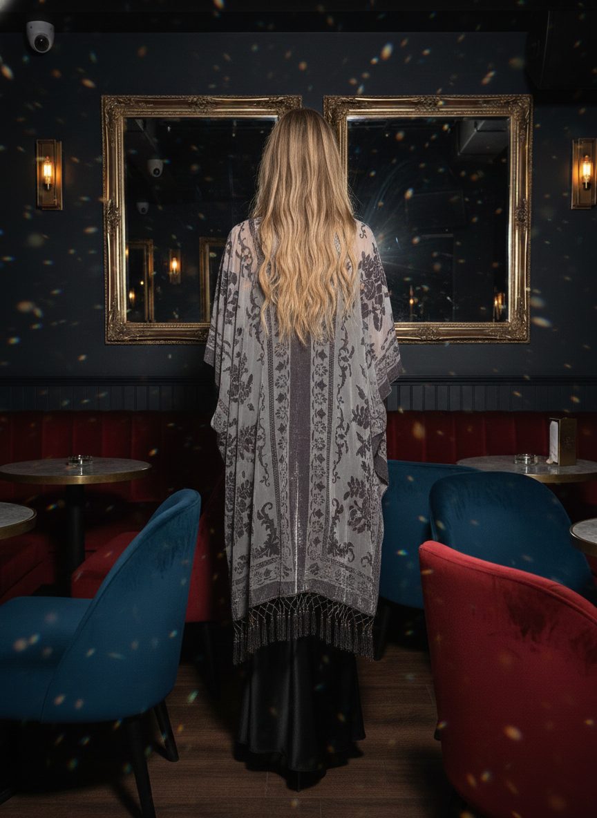 Kimono bohemio con motivos florales de terciopelo devoré con flecos.