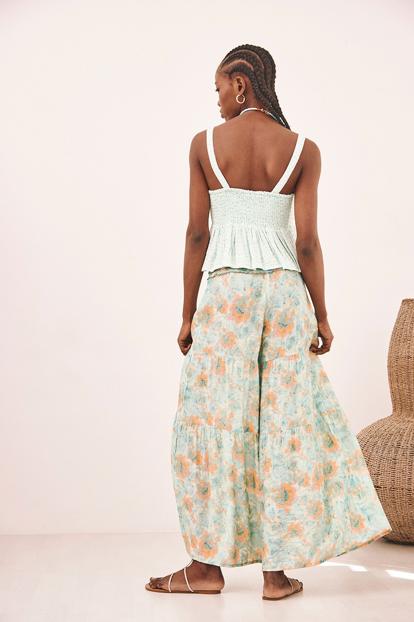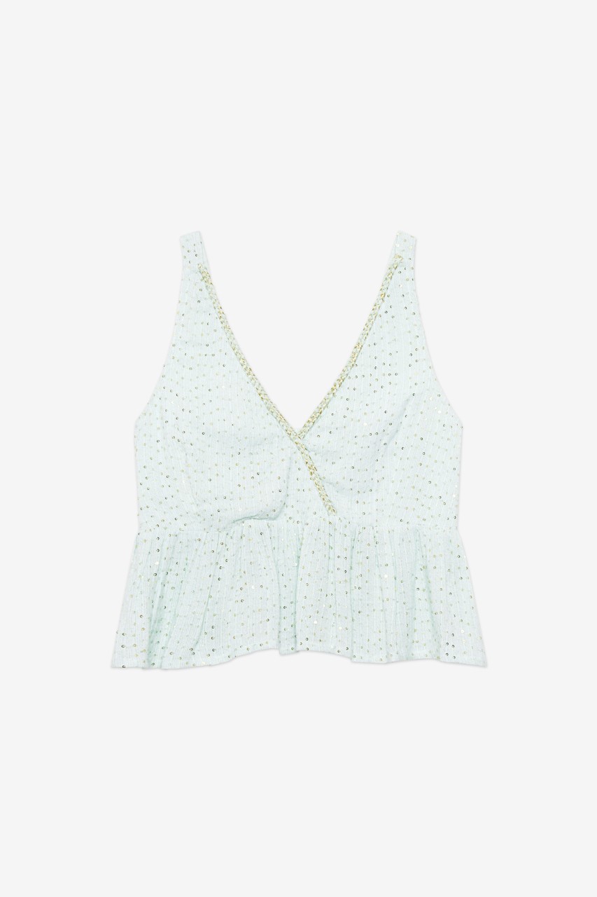 Top corto hasta la cadera de tirantes,  con lentejuelas bordadas en dorado. Detalle cinta bordada en escote pico.