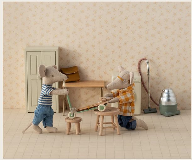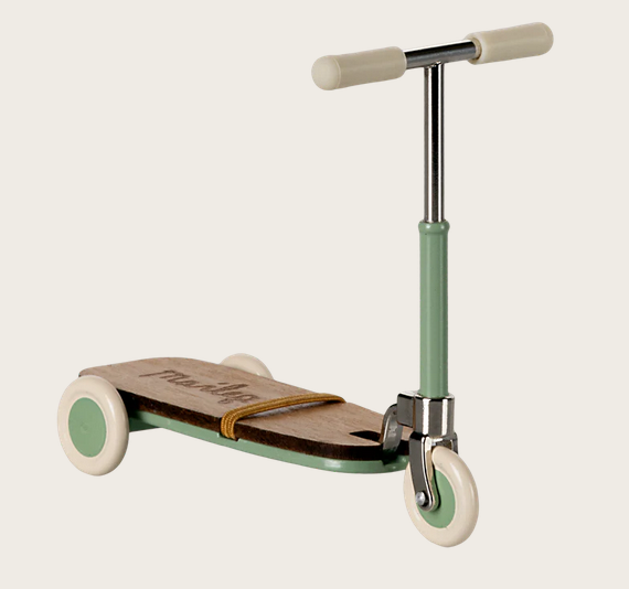 Una patineta con detalles de madera. Tiene metal en el manillar para que los ratones con imanes en las manos se puedan sostener, además de un elástico en la tabla para asegurar que lo pies queden fijos sobre la misma.