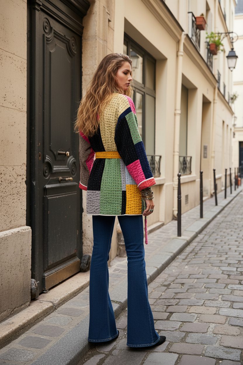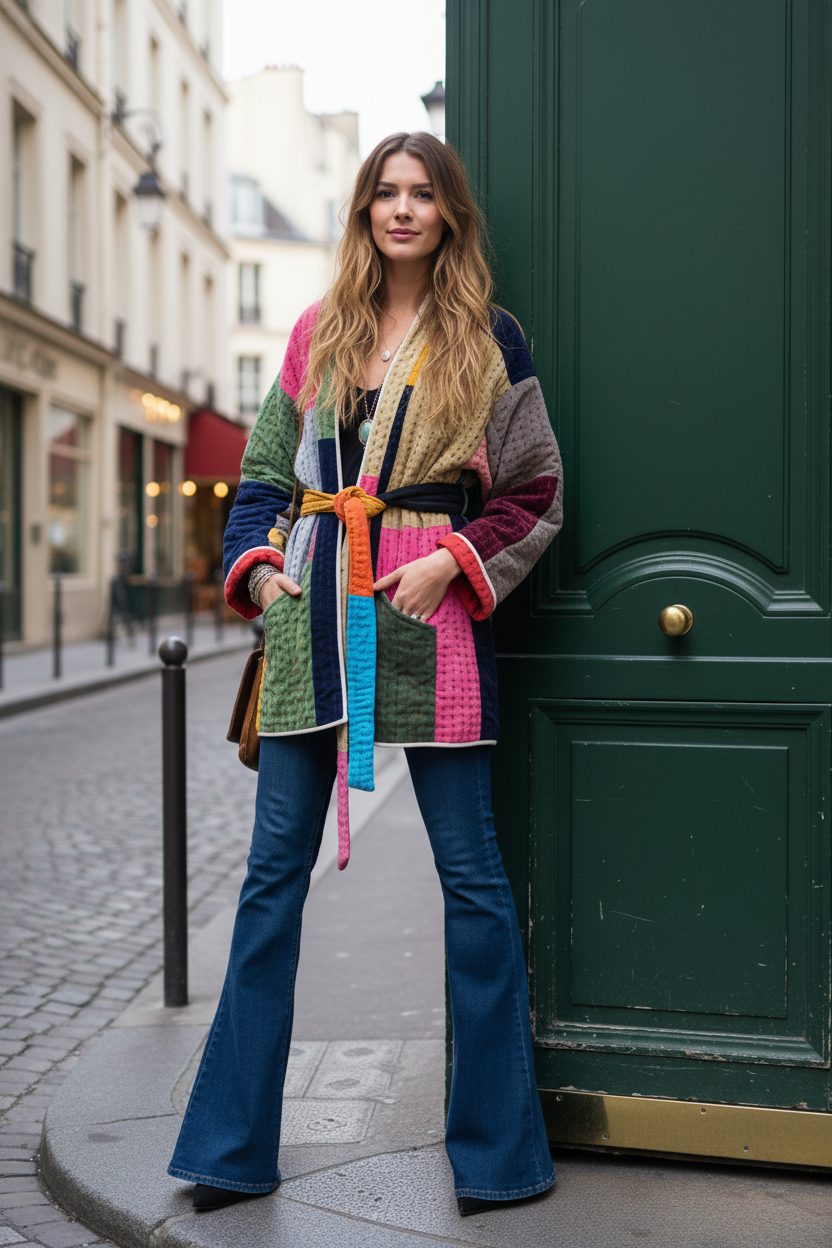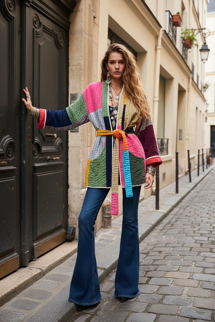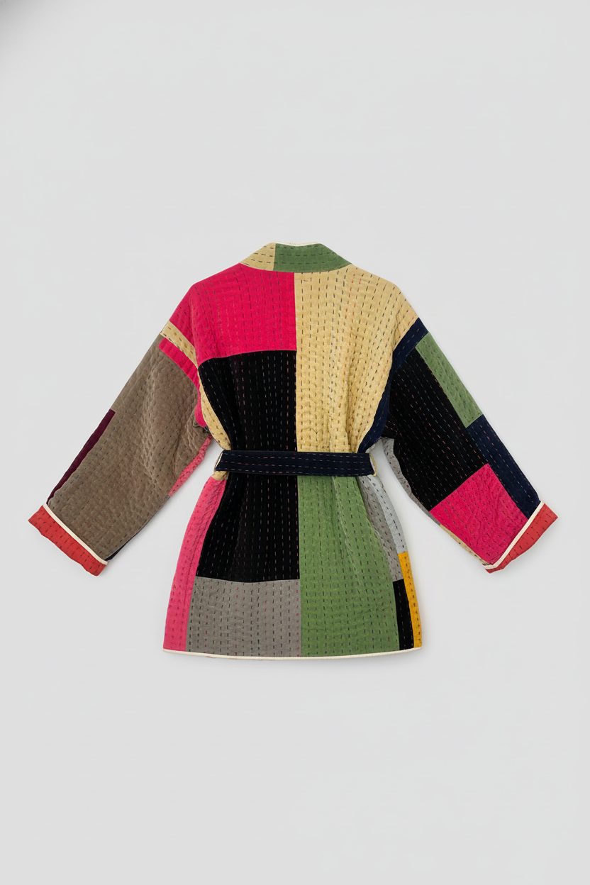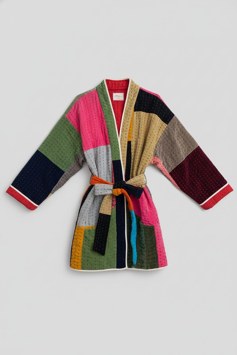 Chaqueta oversize de  patchwork de terciopelo con cinturón.