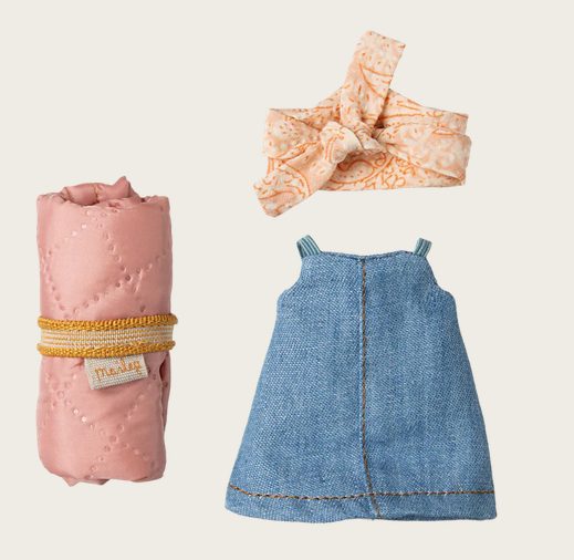 La ratona excursionista de Maileg es toda una aventurera., Lleva camiseta fresca y un sombrero en la cabeza para el sol., Siempre con su saco de dormir ..