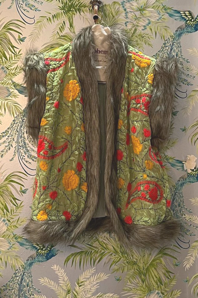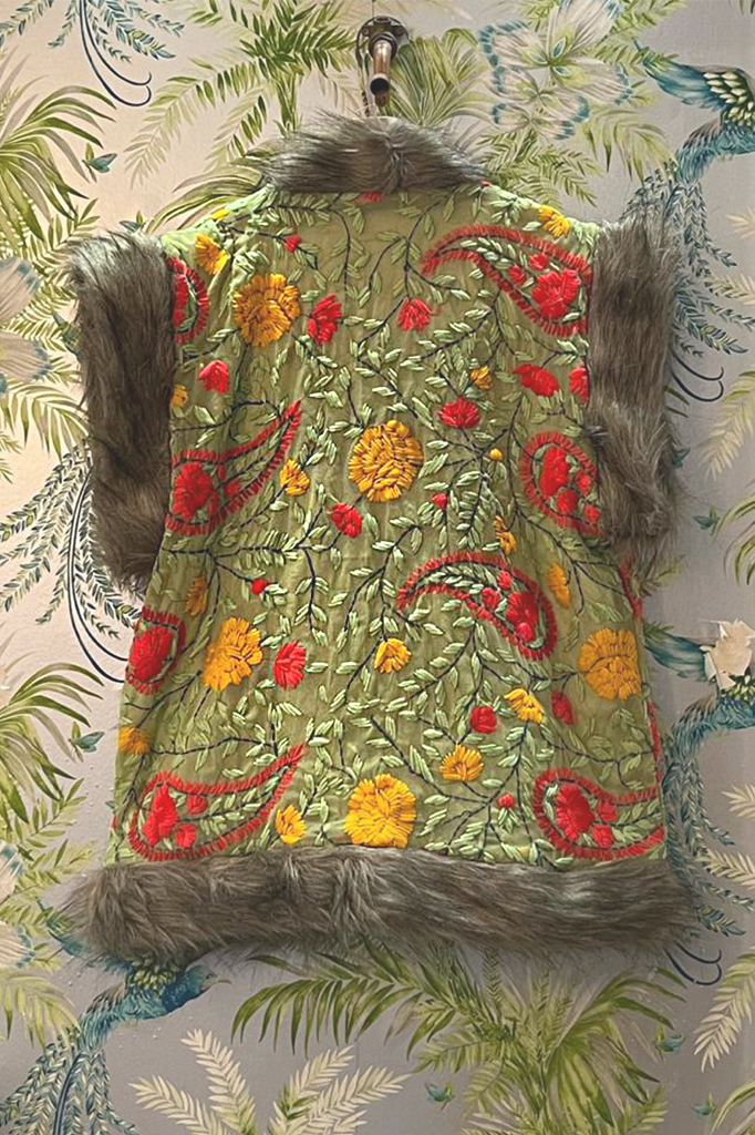 Chaleco bohemio completamente bordado a mano. Ribete de pelo en el frontal, bajo y sisas.