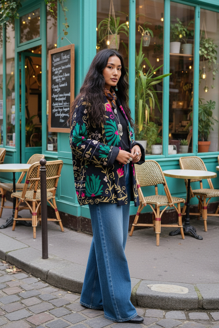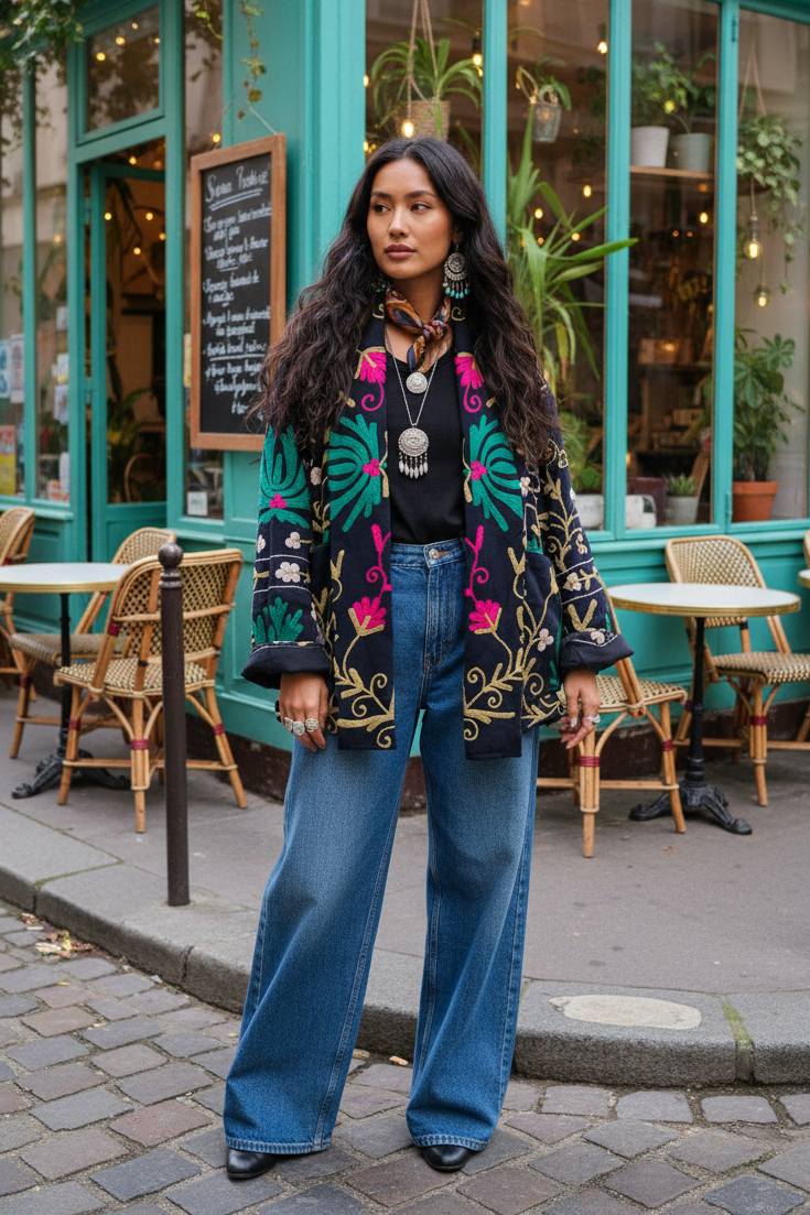 Chaqueta de estilo bohemio bordada con gran solapa y bolsillos.
