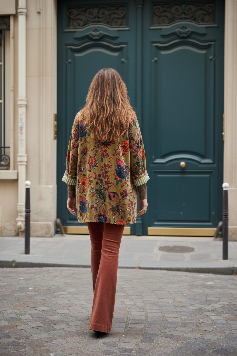 Kimono estampado  de terciopelo de inspiración vintage. Reversible, con una cara estampada y la de rayas,  con bolsillos.