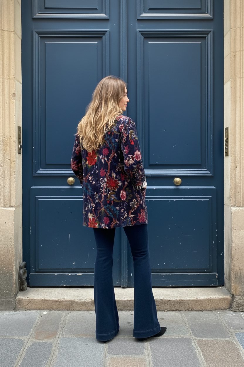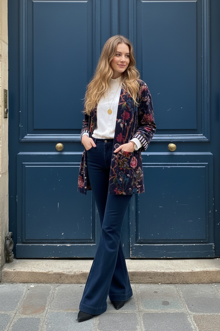 Kimono estampado  de terciopelo de inspiración vintage. Reversible, con una cara estampada y la de rayas,  con bolsillos.