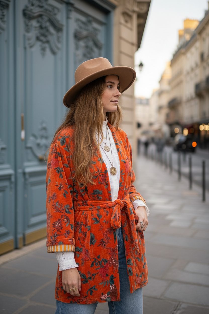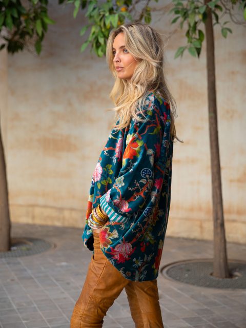 Kimono estampado de terciopelo de inspiración vintage. Reversible, con una cara estampada y la otra de rayas, con bolsillos.