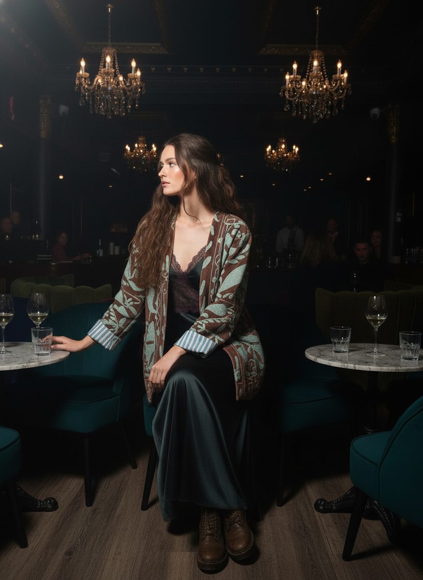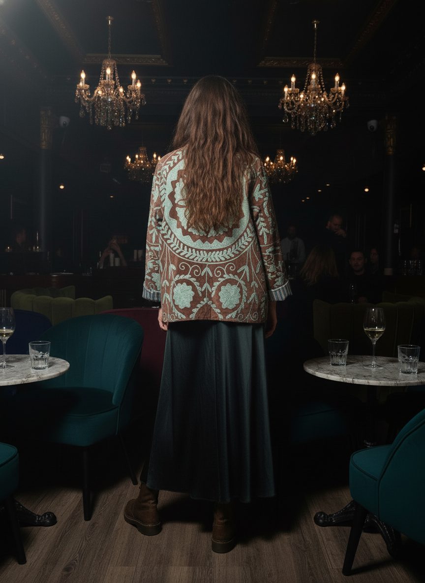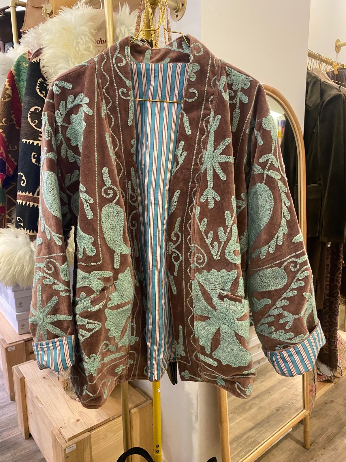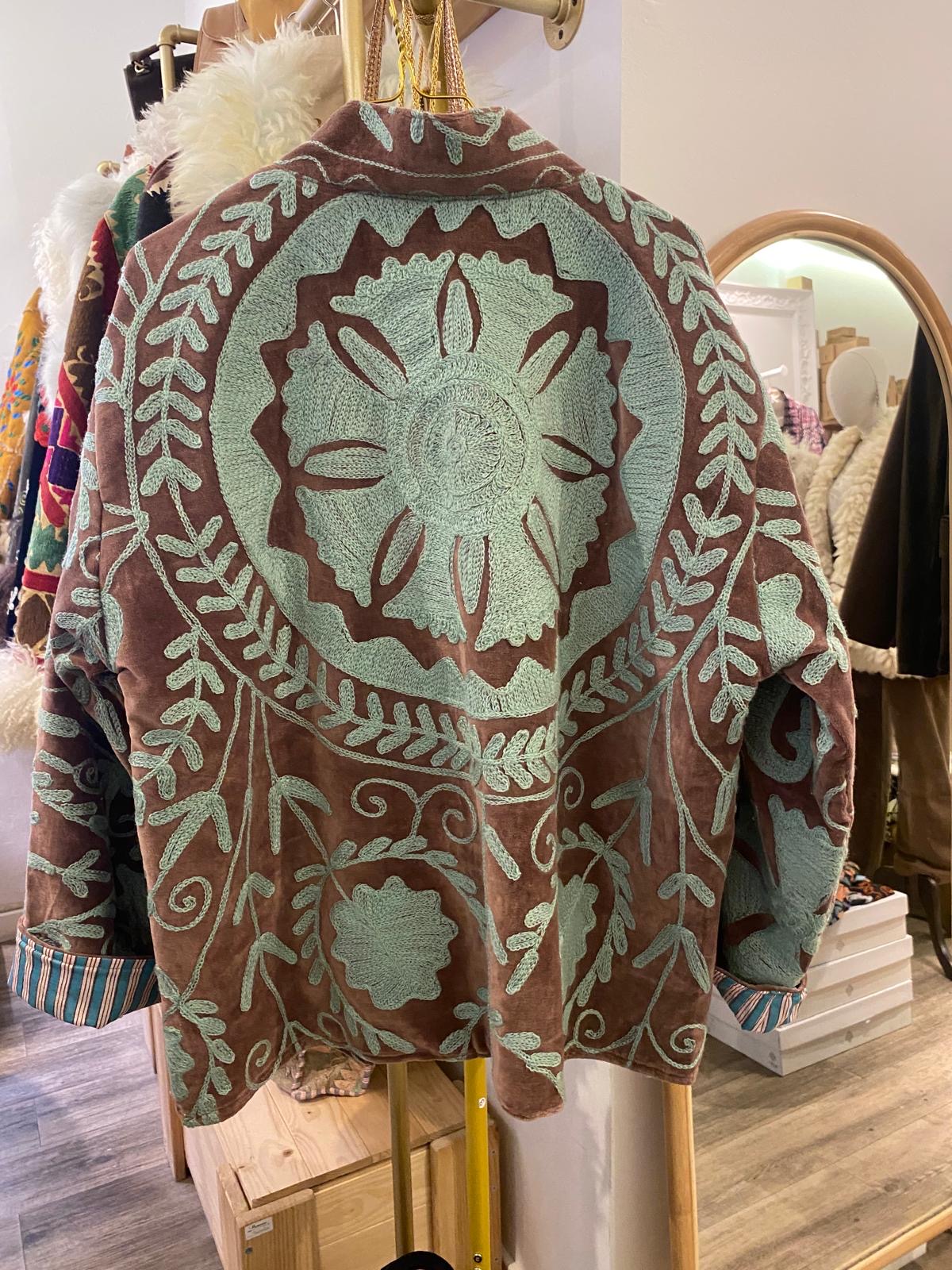 Chaqueta-kimono de terciopelo completamente bordado de forma artesanal.