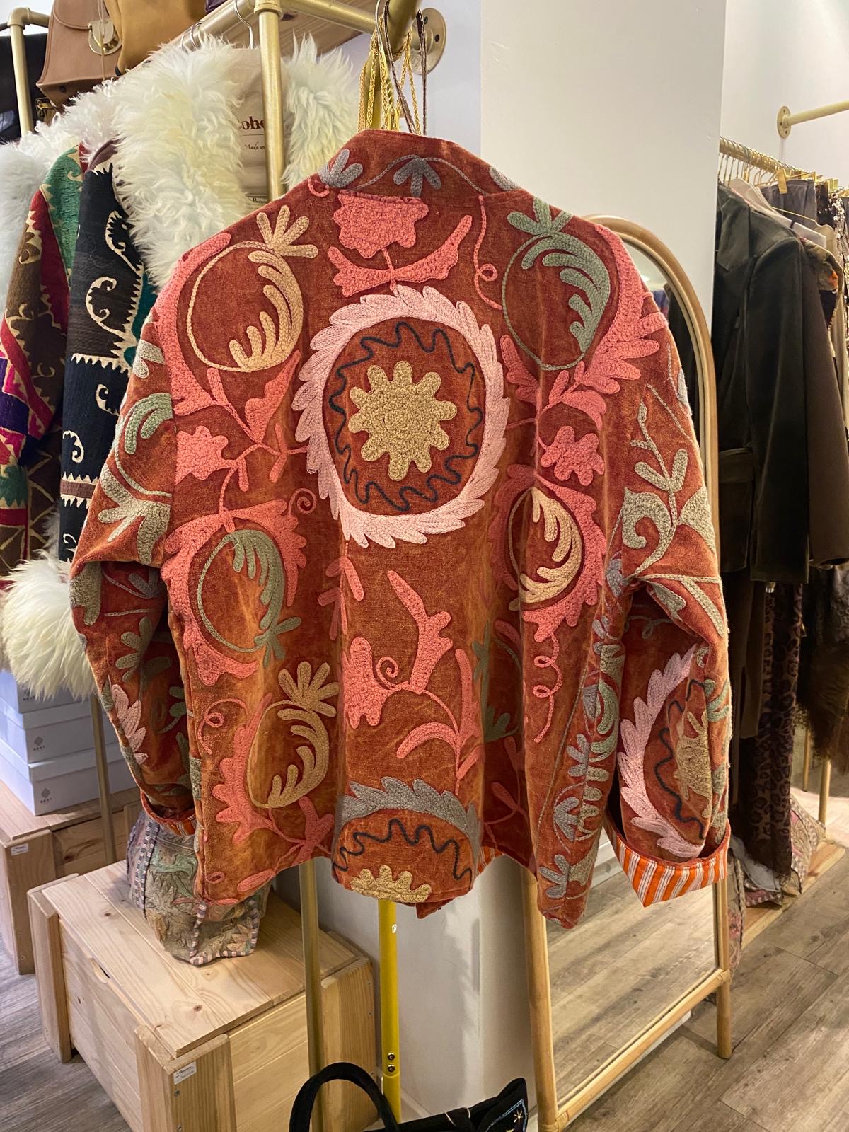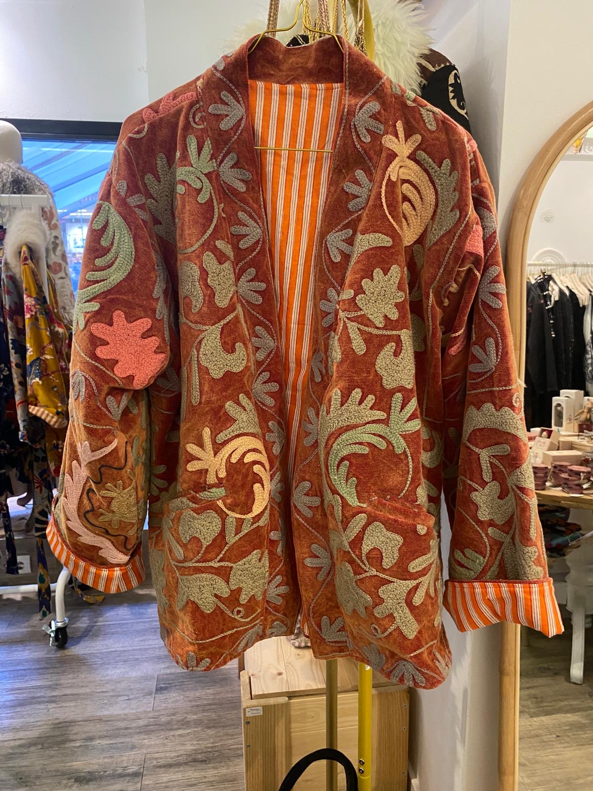 Chaqueta-kimono de terciopelo completamente bordado de forma artesanal.